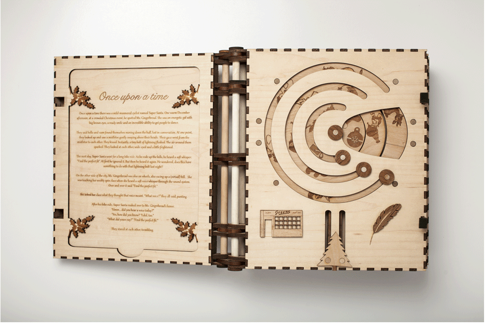 Eric proposed to me the eve of my birthday. It was absolutely epic and took me by complete surprise. He had spent the past year designing and building a fairy tale proposal book with secret puzzles inside every chapter. He knew that I loved making story books for my family when I was a little girl so he decided to create a fairytale story based on our relationship. The book is about the two main characters - Super Santa and Ms. Gingerbread and and their quest to find The Perfect Fit. What is the Perfect Fit? Neither of them know.... yet. Each chapter in the book is accompanied by a puzzle I had to solve in order to get to the next chapter.